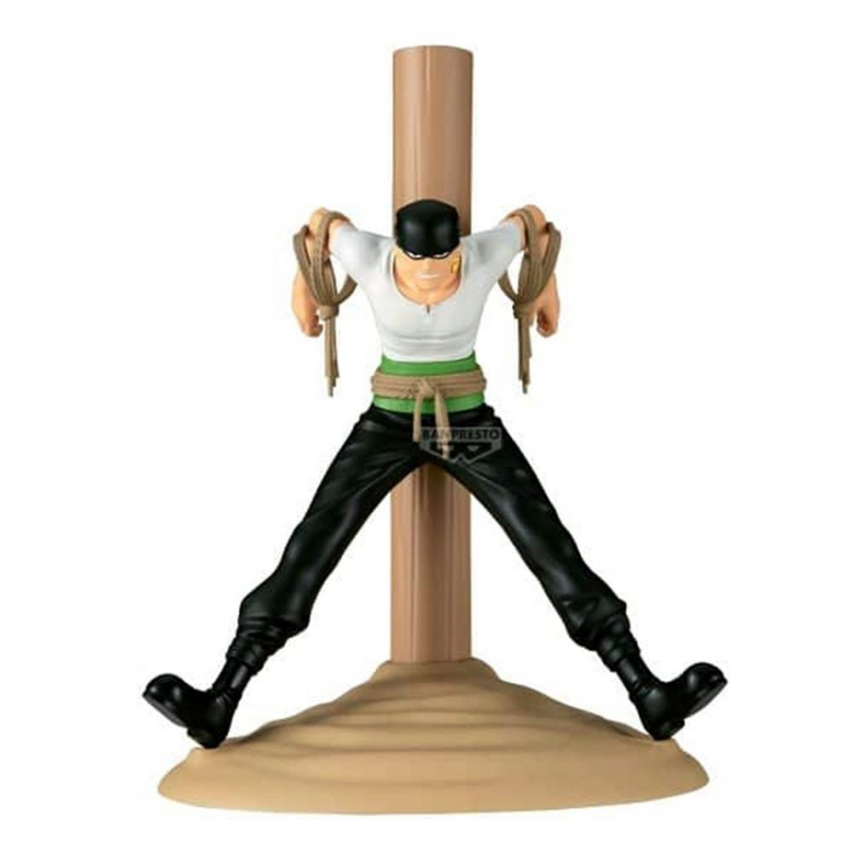 Zoro está esculpido en una pose de combate que captura perfectamente su carácter decidido y su estilo de lucha único. Cada detalle, desde sus espadas hasta su expresión facial, ha sido trabajado con precisión para ofrecer una figura de gran impacto visual.