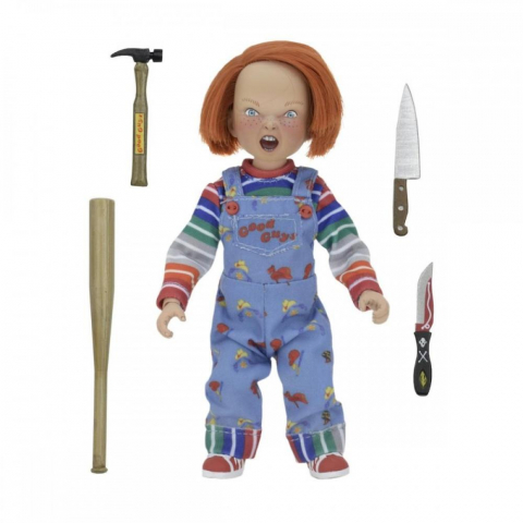 Inspirado en las películas clásicas de terror de Chucky, el muñeco asesino poseído por el alma de un asesino en serie ya está disponible como figura de acción completamente articulada y vestida de NECA. Chucky mide aproximadamente 14 centímetros de alto y está completamente articulado. La figura viste ropa de tela y tiene el pelo enraizado. Incluye accesorios como un bate de béisbol, un cuchillo vudú, un cuchillo normal y un martillo de los Good Guys. ¡El empaque presenta ilustraciones de Jason Edmiston! Estas figuras no son juguetes para niños. Destinadas solo para adultos.