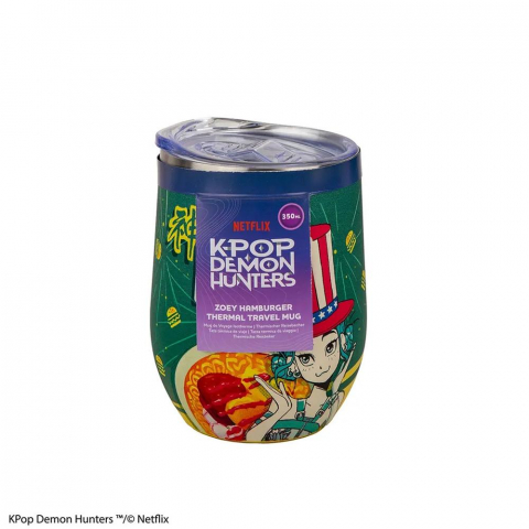 La Taza de Viaje Isotérmica Cinereplicas KPOP Demon Hunters Zoey Hamburger es una pieza oficial con licencia de Netflix, diseñada para fans del anime, el K-pop y las estéticas vibrantes de la serie. Su ilustración a todo color muestra a Zoey Hamburger con un estilo manga llamativo, acompañada de detalles gráficos tipo “etiqueta nutricional” que aportan un toque humorístico y coleccionista.