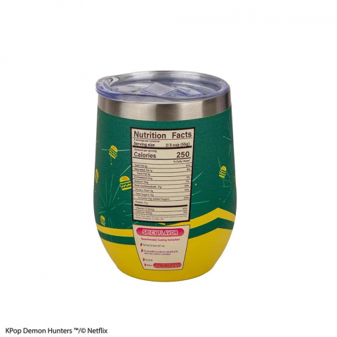 Esta taza de viaje presenta una ilustración de Zoey Hamburger, personaje de la serie "KPOP Demon Hunters" de Netflix, con un acabado de colores vivos y detalles que simulan una etiqueta de información nutricional en la parte trasera, a modo de parodia visual. Una pieza de colección original y funcional.