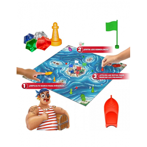 El objetivo es claro: ser el primero en reunir los 4 tipos de tesoros escondidos en el centro del tablero. Pero para llegar hasta ellos deberás navegar con cuidado, evitar los remolinos y regresar a salvo a tu puerto. Cada naufragio te hace empezar de nuevo, por lo que la estrategia y la observación son clave.