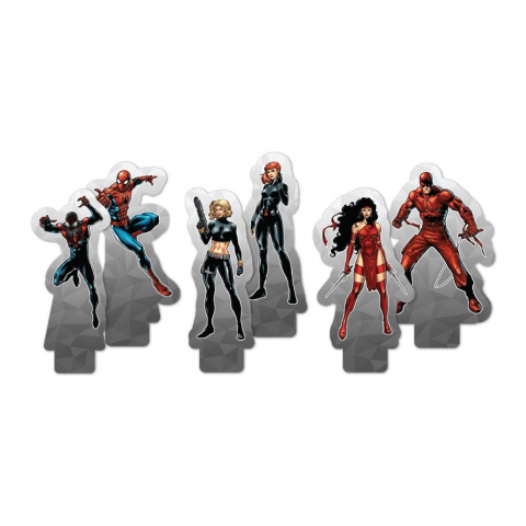 1 cuaderno de reglas - 1 guía de héroes - 1 tablero de juego - 10 hojas de héroe de doble cara - 20 peones de héroe - 6 peanas de aspecto - 6 hojas de aspecto - 4 hojas de supervillano - 4 peones de